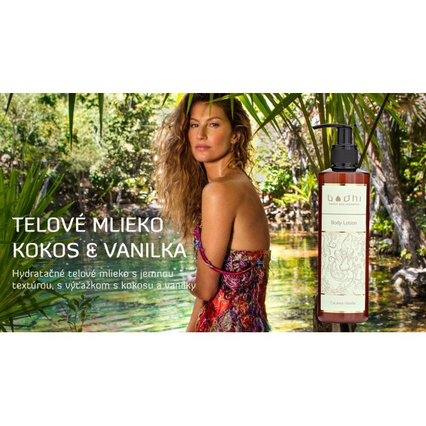 Kokosové tělové mléko s vůní vanilky navrací pokožce jemnost a pružnost. Základ télového mléka tvoří rýžový olej a jojobový olej. Rýžový olej podporuje prokrvení, tonizacu pokožky, jojobový olej vytváří na pokožce nemastný ochranný film, jenž zabraňuje nadměrnému vysychání pokožky. Přirodní tělové mléko obsahuje hydrolytické pšeničné proteíny a vitamín E, jenž podporují obnovu buněk a pomáhají tak harmonizovat přirozenou rovnováhu pleti.